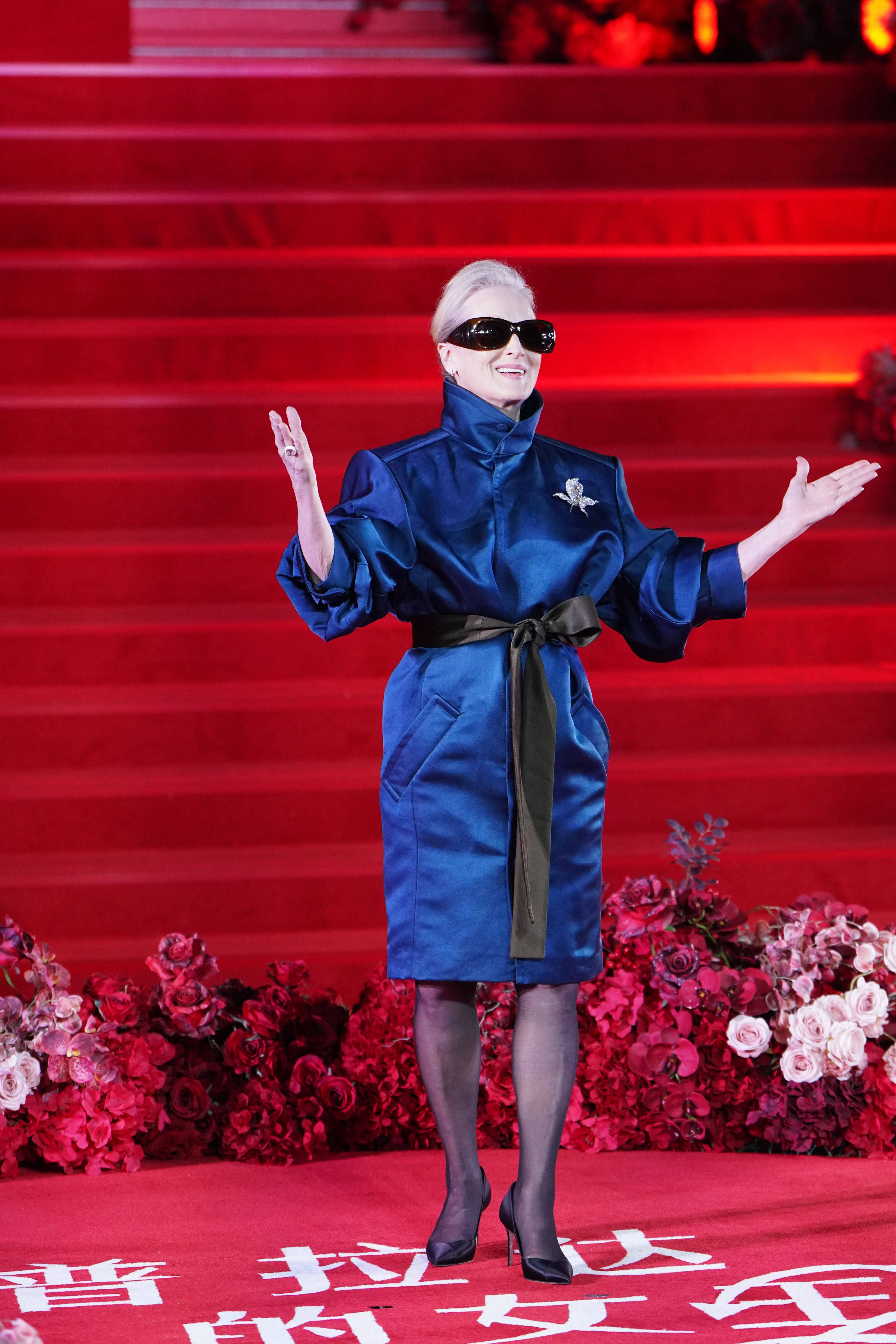 当天,梅姨脸上戴着墨镜,身穿蓝色连衣裙,优雅大气,气场全开;安妮·海瑟薇则是一袭粉蓝色蓬蓬裙登场,温柔明媚。红毯上,两人开心热舞,安妮还用中文感谢中国粉丝,她甚至激动到差点落泪,直呼很感动。