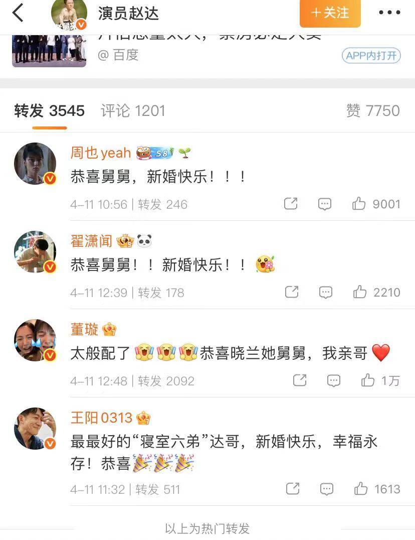 曾与赵达在《你好1983》中合作的演员周也,第一时间留言祝贺:“恭喜舅舅,新婚快乐!”,延续剧中“晓兰舅舅”的称呼,引发剧迷集体回忆。演员王阳也发文祝福这位“寝室六弟”步入婚姻殿堂,兄弟情谊真挚动人。翟潇闻和董璇也送上祝福,他们都在《你好1983》里合作演出。