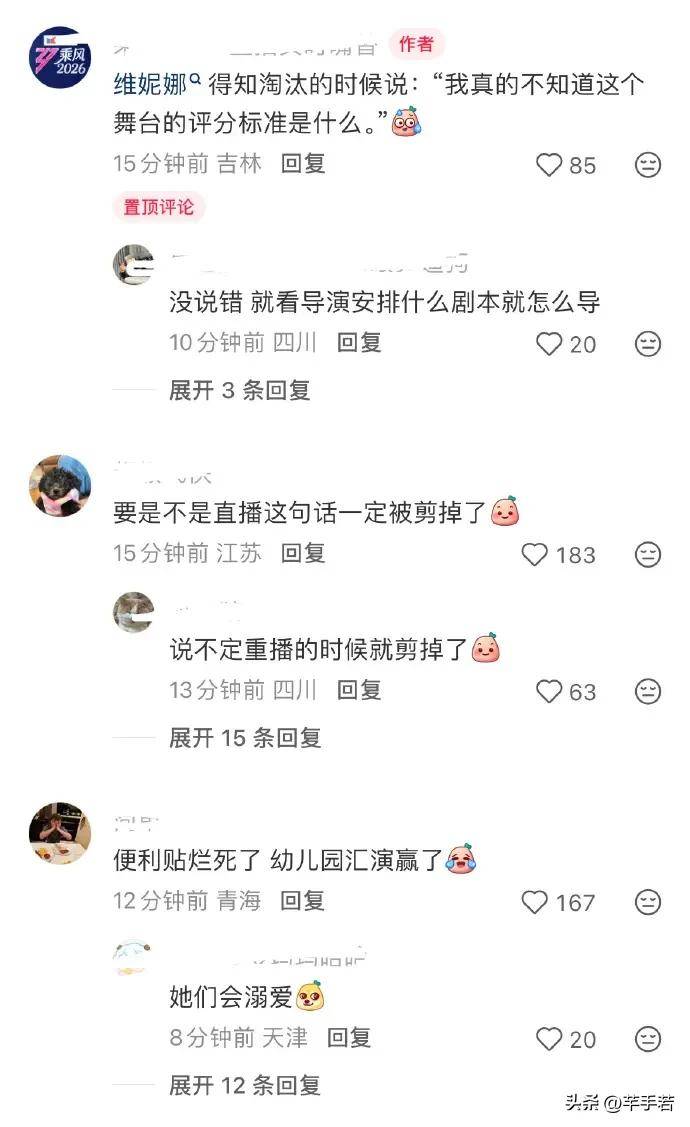 看看广大网友的反应,节目组恐怕也该脸红了。舆论几乎要爆发,这已经是赤裸裸的欺负人。昨天有人爆料今天淘汰的竟是维妮娜,观众并非神通广大,而是看穿了节目组唯人气论的小把戏。在这个节目里,努力和实力被视为笑话,人气才是硬道理,这无形中教给大家的,似乎是人情世故的生存法则。