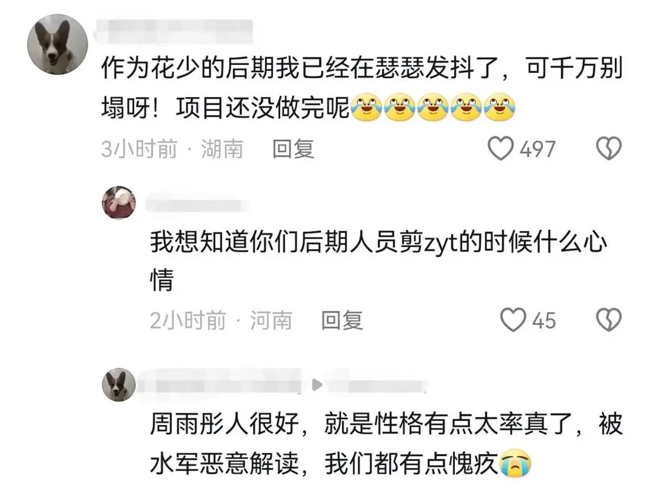 随后有网友就询问该后期人员在剪辑周雨彤的时候都是什么心情,后期回复称“周雨彤人很好,就是性格有点率真,被恶意解读,我们(花少后期)都有点愧疚。”
